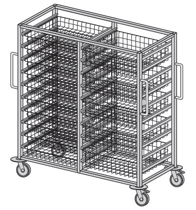 Wózek regałowy systemowy przystosowany do wyposażenia w kosze i kuwety. Wyposażenie: – kosz typ A-01 lub kuweta typ AA-11 – 10 szt. L=538 B=500, H=100 mm. – kosz typ A-02 lub kuweta typ AA-12 – 5 szt. L=538 B=500, H=180 mm.
