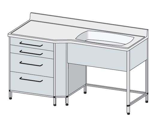 Stanowisko do pielęgnacji niemowląt – kąpielowe. Przeznaczenie: Stanowiska do pielęgnacji noworodków i niemowląt typ STP przeznaczone są do wykonywania wszystkich czynności, związanych z pielęgnacją dzieci na oddziałach położniczych, punktach pielęgnacyjnych, tradycyjnych salach noworodkowych oraz pokojach typu matka z dzieckiem. Charakterystyka: Elementy konstrukcyjne narożne z profili o zaokrąglonych krawędziach chroniących użytkownika przed urazami. Mocny i lekki szkielet tworzący konstrukcję mebla wypełniony laminowanymi płytami meblowymi, panelami z tworzywa, blachą lakierowaną lub nierdzewną, blat z wanienką wykonany z żywic szklano-poliestrowych. Wyposażenie standardowe stanowią: materacyk pokryty PCV, szuflady, kosze i kuwety wysuwne na materiały i środki pielęgnacyjne, syfon wodno-kanalizacyjny. W opcji doposażenie w baterię kąpielową termostatyczną. W zależności od potrzeb każde ze stanowisk może być dodatkowo wyposażone w ogrzewacz noworodków.