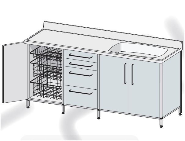 Stanowisko do pielęgnacji niemowląt – kąpielowe. Przeznaczenie: Stanowiska do pielęgnacji noworodków i niemowląt typ STP przeznaczone są do wykonywania wszystkich czynności, związanych z pielęgnacją dzieci na oddziałach położniczych, punktach pielęgnacyjnych, tradycyjnych salach noworodkowych oraz pokojach typu matka z dzieckiem. Charakterystyka: Elementy konstrukcyjne narożne z profili o zaokrąglonych krawędziach chroniących użytkownika przed urazami. Mocny i lekki szkielet tworzący konstrukcję mebla wypełniony laminowanymi płytami meblowymi, panelami z tworzywa, blachą lakierowaną lub nierdzewną, blat z wanienką wykonany z żywic szklano-poliestrowych. Wyposażenie standardowe stanowią: materacyk pokryty PCV, szuflady, kosze i kuwety wysuwne na materiały i środki pielęgnacyjne, syfon wodno-kanalizacyjny. W opcji doposażenie w baterię kąpielową termostatyczną. W zależności od potrzeb każde ze stanowisk może być dodatkowo wyposażone w ogrzewacz noworodków.