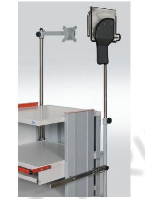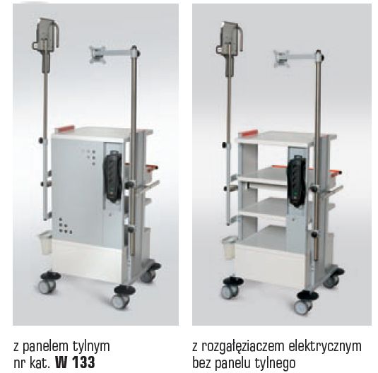 Wózki z proponowanej serii „TRIBO-MED” przystosowane są do specjalistycznej aparatury medycznej. Otwarta i sztywna konstrukcja słupowa umożliwia szybką zmianę konfiguracji rozstawu półek stosownie do oczekiwanych potrzeb. Szeroki asortyment specjalistycznych elementów wyposażenia dodatkowego gwarantuje niezbędny komfort pracy z zachowaniem wymaganej funkcji. Wymiary: • wysokość całkowita (przy zastosowaniu standardowych podwójnych kół jezdnych o średnicy Ř100 mm) w zależności od typu wózka wynosi: 860 mm; 1200 mm lub 1455 mm. • pozostałe wymiary gabarytowe i użytkowe podano szczegółowo w dalszej części katalogu dla każdego modelu wózka. Konstrukcja: • kolumny nośne z blachy stalowej profilowanej z rastrem do montażu półek. Zakres zmiany położenia półek środkowych ±30 mm od pozycji zwymiarowanych na rysunkach technicznych; • kontener i czoło szuflady metalowe, dwuwarstwowy, szczelny; • ramy szuflad na prowadnicach kulkowych z funkcją pełnego wysuwu; • wkłady szufladowe wykonane metodą termoformowania z wysokoudarowego tworzywa ABS w szerokiej gamie rodzajowej i wymiarowej z podziałami wewnętrznymi. Nośności użytkowe: • stelaż nośny 1500 N/150 kg; • półka stała 300 N/30 kg; • półka wysuwana 50 N/5 kg; • szuflada 150 N/15 kg. Powłoka lakiernicza: Wszystkie elementy pokryte są wysokiej jakości lakierem proszkowym, odpornym na uszkodzenia mechaniczne, działanie środków dezynfekcyjno-myjących i promieniowanie UV w pełnej gamie kolorystycznej, zgodnej z paletą barw wg RAL. Kolorystyka standardowa: • konstrukcja nośna i kontener szufladowy w kolorze podstawowym RAL 7040; • półki w kolorze podstawowym RAL 7047. Wózki do aparatury medycznej z serii „TRIBO-MED” to: • bogaty wybór specjalistycznego wyposażenia dodatkowego zgodnie z wykazem elementów wyposażenia; • raster montażowy umożliwiający samodzielną zmianę rozstawu półek; • kanał kablowy z rozgałęziaczem elektrycznym wielogniazdowym; • półki z wykonstruowanymi podwyższonymi brzegami zapewniające dużą sztywność oraz bezpieczeństwo ustawionych urządzeń i aparatury; • półka wysuwna do klawiatury komputerowej gwarantująca komfort obsługi aparatury; • uchwyt wózka umożliwiający wygodne przemieszczanie w całości wyposażonego wózka; • pojemnik szufladowy z zamocowaną uszczelką szufladową i zamkiem patentowym w standardzie; • szuflady poruszające się na prowadnicach teleskopowych typu kulkowego, z mechanizmem zapewniającym właściwy docisk frontu szuflady do uszczelki; • front szufladowy metalowy stabilnie zamontowany do szuflady z ergonomicznym uchwytem; • szeroki wybór kolorystyczny; • wymienny wkład do szuflady wykonany z wysokoudarowego tworzywa ABS gwarantujący łatwość utrzymania niezbędnego standardu higienicznego dla przechowywanych materiałów. • zespół jezdny zbudowany z 4 podwójnych rolek o średnicy Ř100 mm. Koła wykonane z materiału antystatycznego i niebrudzącego podłoże. Dwa koła wyposażone w hamulec i blokadę obrotu; • odboje zabezpieczające korpus i osprzęt wózka przed uszkodzeniem.