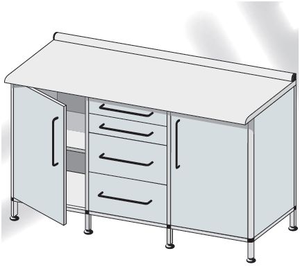 Zabudowa przyścienna trzykomorowa. Wykonane w różnych konfiguracjach wymiarowych i rodzajowych. Standardowo drzwi otwierane są ze strony prawej na lewą lub na życzenie Zamawiającego odwrotnie. Wyposażone w jedną przestawną, regulowaną półkę. W standardzie stópki z regulacją wysokości, zamki patentowe jedno- lub wielopunktowe. Blaty robocze z fartuchem tylnym. Standardowo wykonane jak pokazano na poniższych schematach jako laminowane. Na życzenie Zamawiającego blaty mogą być z innych materiałów zgodnie z zamieszczonym opisem (str. 129-132 katalogu). Szuflady typu skrzyniowego wykonane z tworzywa ABS z wyoblonymi i szczelnymi krawędziami wewnętrznymi w różnym asortymencie wymiarowym.