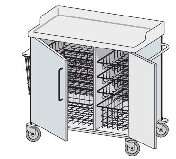 Wózek ogólnozabiegowy. Wyposażenie wózka: – kosz typ A-01 lub kuweta typ AA-11 – 3 szt. L=538, B=500, H=100 mm – kosz typ A-02 lub kuweta typ AA-12 – 1 szt. L=538, B=500, H=180 mm – kosz typ A-04 – 3 szt. L=268, B=500, H=100 mm – kosz typ A-05 – 1 szt. L=268, B=500, H=180 mm - stelaż z pokrywą do worka na odpady miękkie nr kat. W 224. Wózki modułowe standardowo wyposażone w prowadnicę modułową z tworzywa ABS lub systemowe wysuwane metalowe ramy do osadzenia koszy i kuwet z tworzywa. Proponowane przykładowe wyposażenie może być modyfikowane zgodnie z tabelą wyposażenia na str. 63 katalogu, z zachowaniem podanych ilości przy opisanych gabarytach organizerów. W opcji zamki patentowe jedno- i wielopunktowe typu baskwil. Blaty robocze z tworzywa ABS standardowo wykonane jak pokazano na poniższych schematach z krawędzią boczną podniesioną lub bez krawędzi bocznych. Na życzenie Zamawiającego blaty mogą być wykonane z innych materiałów.