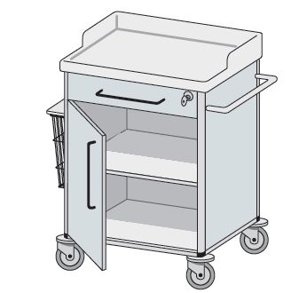 Wózek anestezjologiczny. Wyposażenie: – stelaż z pokrywą do worka na odpady miękkie nr kat. W 224. Wózki modułowe standardowo wyposażone w prowadnicę modułową z tworzywa ABS lub systemowe wysuwane metalowe ramy do osadzenia koszy i kuwet z tworzywa. Proponowane przykładowe wyposażenie może być modyfikowane zgodnie z tabelą wyposażenia na str. 63 katalogu, z zachowaniem podanych ilości przy opisanych gabarytach organizerów. W opcji zamki patentowe jedno- i wielopunktowe typu baskwil. Blaty robocze z tworzywa ABS standardowo wykonane jak pokazano na poniższych schematach z krawędzią boczną podniesioną lub bez krawędzi bocznych. Na życzenie Zamawiającego blaty mogą być wykonane z innych materiałów.