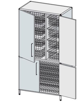 Szafa opatrunkowo-zabiegowa z koszami. Wyposażenie: – kosz typ A-02 lub kuweta typ AA-12 – 4 szt. L=538, B=500, H=180 mm – kosz typ A-05 – 4 szt. L=268, B=500, H=180 mm – kosz typ A-03 – 6 szt. L=835, B=500, H=100 mm.