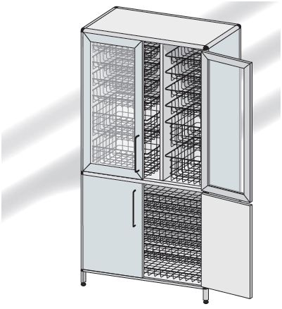 Szafa opatrunkowo-zabiegowa przeszklona górą z koszami. Wyposażenie: – kosz typ A-01 lub kuweta typ AA-11 – 4 szt. L=538, B=500, H=100 mm – kosz typ A-02 lub kuweta typ AA-12 – 2 szt. L=538, B=500, H=180 mm – kosz typ A-04 – 4 szt. L=268, B=500, H=100 mm – kosz typ A-05 – 2 szt. L=268, B=500, H=180 mm – kosz typ A-03 – 6 szt. L=835, B=500, H=100 mm.