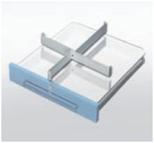 Wkład do szuflady niskiej. Metalowy lakierowany techniką proszkową w kolorze białym. Konstrukcja umożliwia samodzielny montaż i demontaż oraz zmianę podziału szuflady jak W 232.
