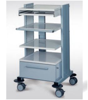 Z uwagi na różnorodne gabaryty stosowanych urządzeń medycznych, w proponowanej serii wózków do aparatury medycznej wyróżniamy dwie podstawowe długości półek L=640 mm oraz L=540 mm, co zobrazowane jest w oznaczeniu typu wózka. W wykonaniu standardowym: – regulacja wysokości półek środkowych w górę/dół co 30 mm w zakresie ±60 mm od pozycji zwymiarowanej na rysunku technicznym; – wysuwana półka do klawiatury komputerowej nr kat. W 131; – zamek patentowy szuflady; – kanał kablowy z rozgałęziaczem elektrycznym 4-gniazdowym nr kat. W 121. Wymiary gabarytowe półki [mm]:górna/dolna: 565×540; środkowe: 525×540. Wymiary użytkowe półki [mm]: górna/dolna: 495×470; środkowe: 455×470.