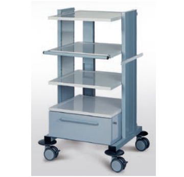 Model podstawowy WA 54/30K bez półki do klawiatury komputerowej nr kat. W 131 doposażony: – szyna sprzętowa nr kat. W 202; – wkład szufladowy nr kat. W 274. Z uwagi na różnorodne gabaryty stosowanych urządzeń medycznych, w proponowanej serii wózków do aparatury medycznej wyróżniamy dwie podstawowe długości półek L=640 mm oraz L=540 mm, co zobrazowane jest w oznaczeniu typu wózka. W wykonaniu standardowym: – regulacja wysokości półek środkowych w górę/dół co 30 mm w zakresie ±60 mm od pozycji zwymiarowanej na rysunku technicznym; – wysuwana półka do klawiatury komputerowej nr kat. W 131; – zamek patentowy szuflady; – kanał kablowy z rozgałęziaczem elektrycznym 4-gniazdowym nr kat. W 121. Wymiary gabarytowe półki [mm]:górna/dolna: 565×540; środkowe: 525×540. Wymiary użytkowe półki [mm]: górna/dolna: 495×470; środkowe: 455×470.