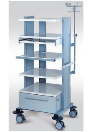 Model podstawowy WA 54/40K doposażony: – wieszak na uchwyt endoskopu nr kat. W 111; – szyna sprzętowa nr kat. W 202; – wkład szufladowy nr kat. W 274. Z uwagi na różnorodne gabaryty stosowanych urządzeń medycznych, w proponowanej serii wózków do aparatury medycznej wyróżniamy dwie podstawowe długości półek L=640 mm oraz L=540 mm, co zobrazowane jest w oznaczeniu typu wózka. w wykonaniu standardowym: – regulacja wysokości półek środkowych w górę/dół co 30 mm w zakresie ±60 mm od pozycji zwymiarowanej na rysunku technicznym; – wysuwana półka do klawiatury komputerowej nr kat. W 131; – zamek patentowy szuflady; – kanał kablowy z rozgałęziaczem elektrycznym 4-gniazdowym nr kat. W 121. Wymiary gabarytowe półki [mm]:górna/dolna: 565×540; środkowe: 525×540. Wymiary użytkowe półki [mm]: górna/dolna: 495×470; środkowe: 455×470.