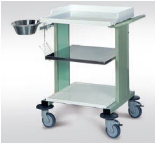 Wózek pielęgniarski. Model podstawowy WK 10 doposażony: • szyna sprzętowa na akcesoria nr kat. W 202; • uchwyt z miską na odpady nr kat. W 226; • stelaż z pokrywą do worka na odpady nr kat. W 224; • półka robocza dolna z blachy kwasoodpornej nr kat. W 201. Wózki funkcyjne z proponowanej serii „TRIBO-MED” przeznaczone są do codziennych potrzeb placówek medycznych jako specjalistyczne wózki pielęgniarskie, opatrunkowe, zabiegowe, anestezjologiczne, reanimacyjne, endoskopowe i inne, ogólnego przeznaczenia. Szeroki asortyment elementów wyposażenia specjalistycznego pozwala na dostosowanie funkcji wózka do własnych potrzeb i decyduje o jego dużej przydatności na każdym oddziale szpitalnym.