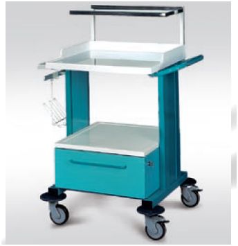 Wózek pielęgniarski. Model podstawowy WK 20 doposażony: • szyna sprzętowa na akcesoria nr kat. W 202; • stelaż z pokrywą do worka na odpady nr kat. W 224; • półka ze stali kwasoodpornej zamontowana na stelażu nr kat. W 241; • wkład szufladowy – 1 × średni nr kat. W 274. Wózki funkcyjne z proponowanej serii „TRIBO-MED” przeznaczone są do codziennych potrzeb placówek medycznych jako specjalistyczne wózki pielęgniarskie, opatrunkowe, zabiegowe, anestezjologiczne, reanimacyjne, endoskopowe i inne, ogólnego przeznaczenia. Szeroki asortyment elementów wyposażenia specjalistycznego pozwala na dostosowanie funkcji wózka do własnych potrzeb i decyduje o jego dużej przydatności na każdym oddziale szpitalnym.