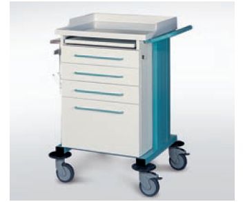 Wózek opatrunkowy. Model podstawowy WK 70 doposażony: • szyna sprzętowa na akcesoria nr kat. W 202; • stelaż z pokrywą do worka na odpady nr kat. W 224; • wkłady szufladowe: – 2 × niski nr kat. W 271; – 1 × niski nr kat. W 272; – 1 × wysoki nr kat. W 276. W 274. Wózki funkcyjne z proponowanej serii „TRIBO-MED” przeznaczone są do codziennych potrzeb placówek medycznych jako specjalistyczne wózki pielęgniarskie, opatrunkowe, zabiegowe, anestezjologiczne, reanimacyjne, endoskopowe i inne, ogólnego przeznaczenia. Szeroki asortyment elementów wyposażenia specjalistycznego pozwala na dostosowanie funkcji wózka do własnych potrzeb i decyduje o jego dużej przydatności na każdym oddziale szpitalnym.
