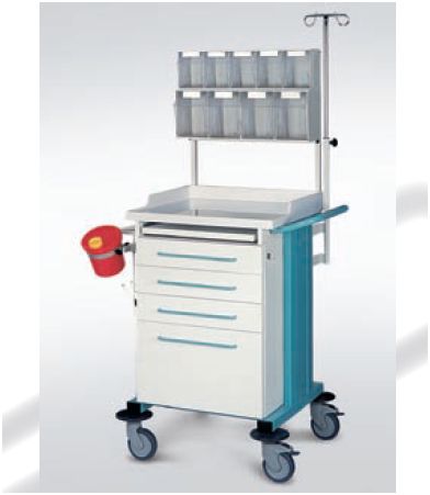 Wózek opatrunkowo-zabiegowy. Model podstawowy WK 70 doposażony: • szyna sprzętowa na akcesoria nr kat. W 202; • stelaż z pokrywą do worka na odpady nr kat. W 224; • uchwyt z pojemnikiem na zużyte igły nr kat. W 225; • zestaw dozowników na materiały opatrunkowozabiegowe nr kat. W 263; • wieszak na kroplówkę nr kat. W 212; • otwieracz do ampułek nr kat. W 228; • wkłady szufladowe: – 2 × niski nr kat. W 271; – 1 × niski nr kat. W 273; – 1 × wysoki nr kat. W 276. Wózki funkcyjne z proponowanej serii „TRIBO-MED” przeznaczone są do codziennych potrzeb placówek medycznych jako specjalistyczne wózki pielęgniarskie, opatrunkowe, zabiegowe, anestezjologiczne, reanimacyjne, endoskopowe i inne, ogólnego przeznaczenia. Szeroki asortyment elementów wyposażenia specjalistycznego pozwala na dostosowanie funkcji wózka do własnych potrzeb i decyduje o jego dużej przydatności na każdym oddziale szpitalnym.