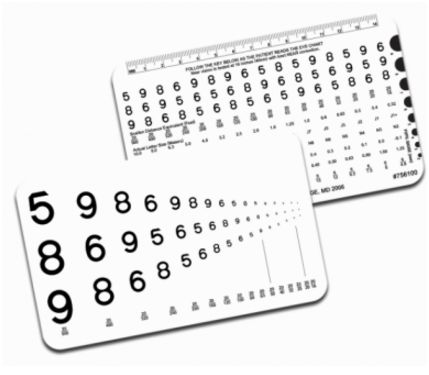 Tablica do bliży z kluczem odpowiedzi po drugiej stronie tablicy. Tablica zawiera również nadrukowany pupilometr w zakresie od 2 do 9 mm ( wartości wyrażone w skali LogMar, Snellen , Jeager, Neat, M.Units )