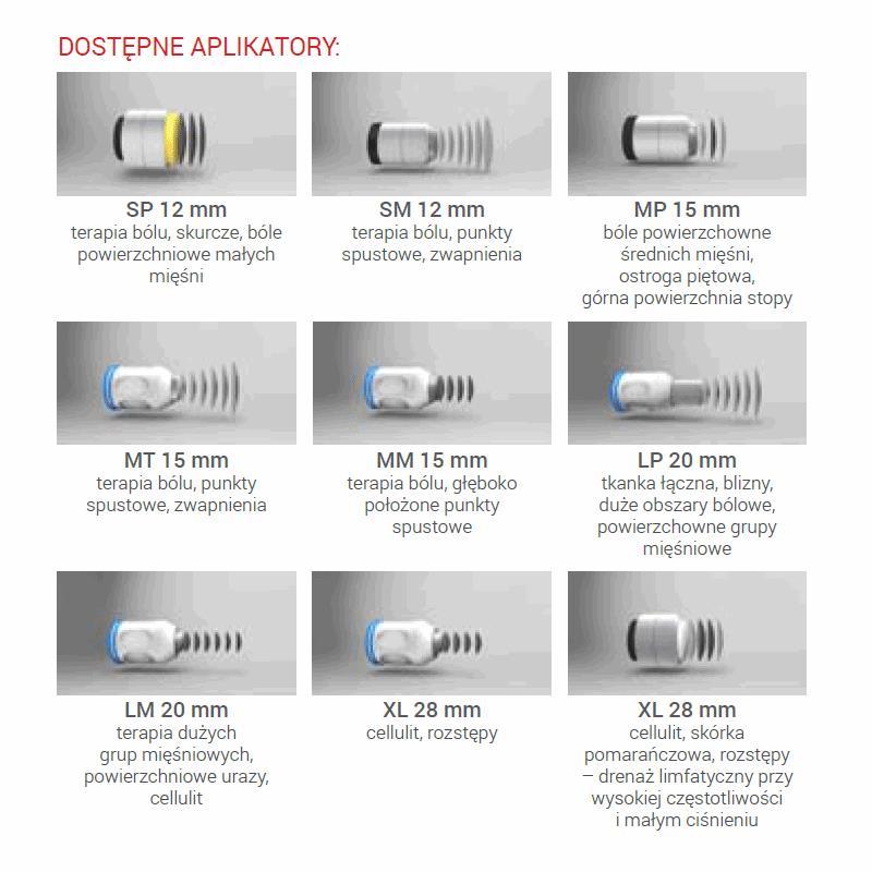 W standardowym wyposażeniu urządzenia do fali uderzeniowej znajdują się 4 aplikatory do różnych zastosowań.