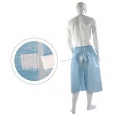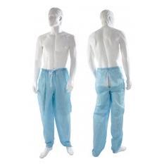 Spodnie wykonane są z włókniny polipropylenowej. Spodnie są proste, luźne, z wdzianą w pasie gumką lub tasiemką, która służy do regulowania obwodu pasa. W tylnej części spodni otwór umożliwiający wykonanie badania.