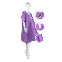 Koszule do porodu wykonane są z miękkiej antystatycznej włókniny polipropylenowej, która nie drażni i nie uczula skóry. Przód koszuli posiada głębokie wycięcie w szpic, które ułatwia karmienie dziecka, a wiązanie i zamknięcie otworu pozwala na zachowanie intymności. Szeroki krój i dwie fałdy na przodzie umożliwiają dopasowanie wyrobu do sylwetki, a rozporki po bokach koszuli nie krępują ruchów.