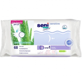 Chusteczki nasączane Sensitive Seni Care. Chusteczki nawilżane do delikatnego oczyszczania skóry wrażliwej i skłonnej do alergii; delikatna formuła; bez parabenów, kompozycji zapachowych oraz alkoholu; łagodzą podrażnienia skóry; duża powierzchnia umożliwia proste i szybkie utrzymanie higieny przez cały dzień; mają przyjazne dla skóry pH 5,5; idealne w czasie podróży. Polecany do: odświeżania wrażliwej skóry. Opakowanie: 68 szt. Używaj chusteczek nasączanych zawsze wtedy, gdy chcesz szybko odświeżyć lub oczyścić skórę. Wyjmij chusteczkę z opakowania i wytrzyj skórę.