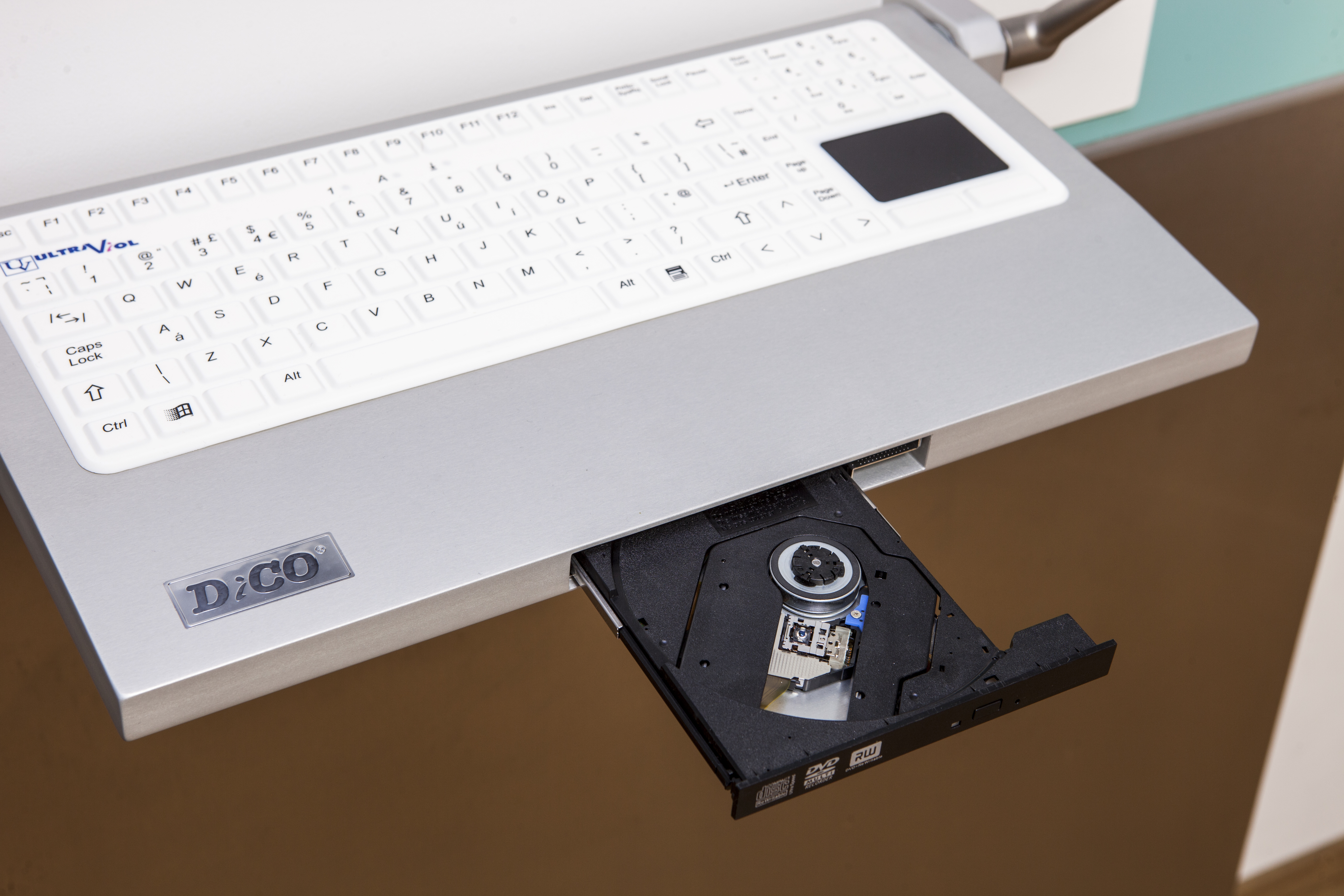 Klawiatura medyczna z powierzchnią silikonową, która zadziała w przypadku zagrożenia, zadziała w przycisku CLEAN, odporną na zarysowania i zadziałanie mechaniczne. Stosowanie środków dezynfekcyjnych stosowanych na salach dezynfekcyjnych. Układ klawiatury: QWERTY wraz z wydzielonym blokiem numerycznym i touchpadem. Konstrukcja oparta na jednym bloku aluminiowym anodowanym z dostępem i zablokowanym pod kątem, złącza zabudowane niewidoczne. Wodoodporność IP68. Interfejs klawiatury USB, współpracujący z systemami operacyjnymi.