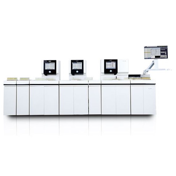 Modułowy system do analizy moczu, w skład którego wchodzą 3 analizatory: dwa analizatory osadu moczu URIT -1320 (każdy o wydajności 120 próbek na godzinę) oraz analizator paskowy UC-1800 (o wydajności 480 próbek na godzinę).