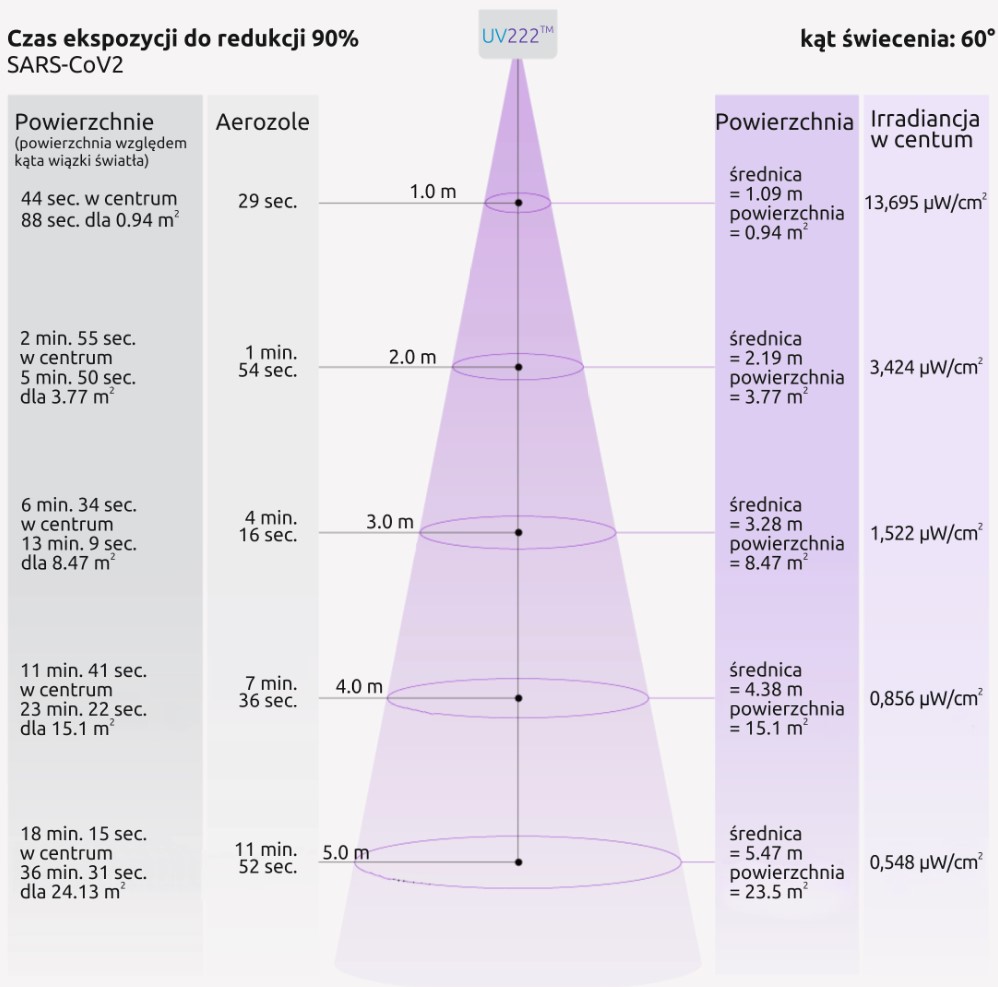 Światło UV-C o długości fali 222 nm jest bardzo skuteczne w zwalczaniu wirusów takich jak SARS-CoV-2, ponieważ białka tworzące tego wirusa mają spektrum absorpcji z pikiem w okolicach 220-230 nm. Oznacza to, że wirusy silnie absorbują światło o długości fali 222 nm, które jest przekształcane w ciepło dezaktywujące wirusa, w tym jego zdolność do infekowania i rozprzestrzeniania choroby. Światło 222nm to skuteczna metoda dezynfekcji z natychmiastowymi rezultatami i wyższą efektywnością niż standardowe światło UVC. Liczne badania naukowe z całego świata udowodniły działanie biobójcze w powietrzu i na powierzchniach. Słupy światła w pomieszczeniu wielokrotnie szybciej czyszczą powietrze w odróżnieniu do przepływowych lamp UVC, które najpierw muszą zassać powietrze do urządzenia i nie gwarantują usunięcia patogenów przez wiele godzin lub dni.