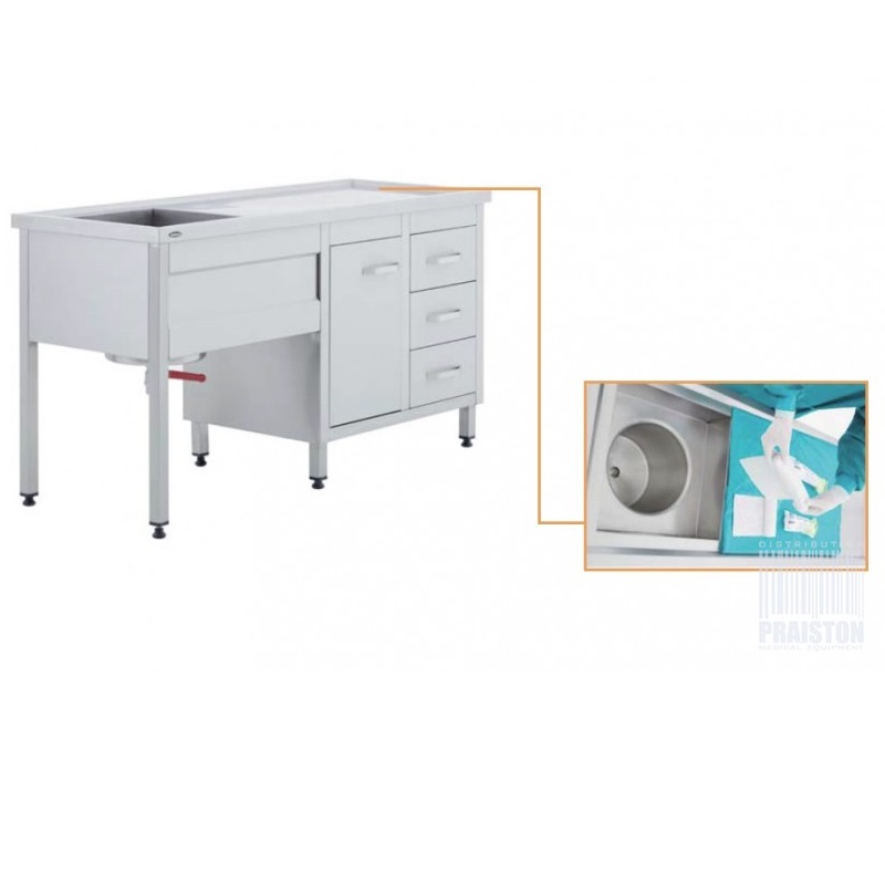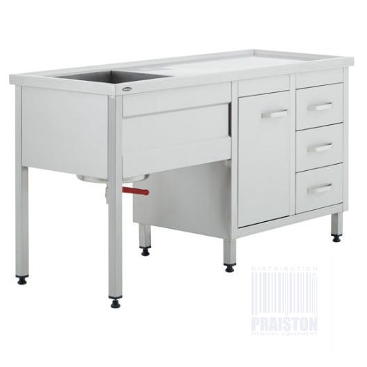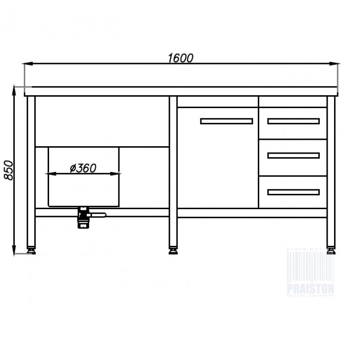 - Wyposażony w zlew, jedną zamykaną szafkę oraz trzy szuflady,