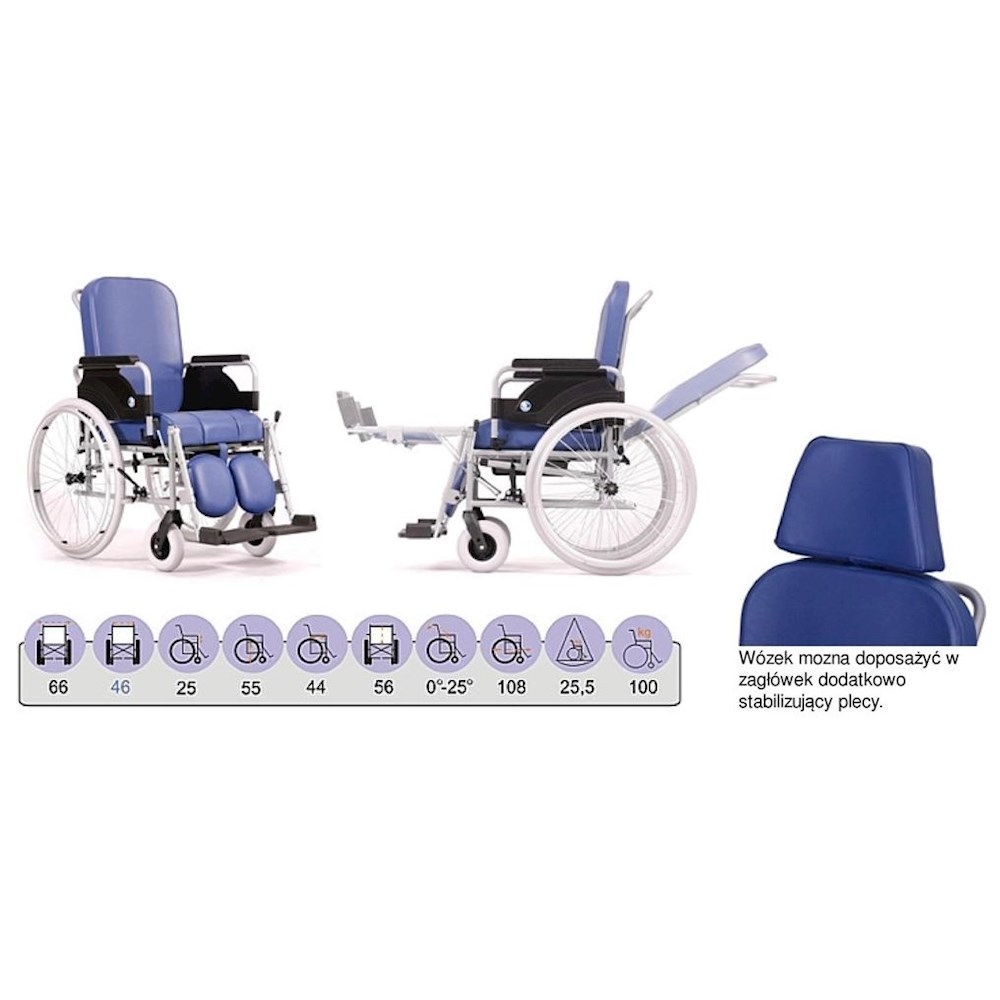 Wózek inwalidzki 9300 to rozwiązanie wysoce funkcjonalne. Model 9300 służy zarówno jako wózek stabilizujący i toaletowy. Niezawodnie stabilizuje głowę i plecy. Pod siedziskiem znajduje się pojemnik sanitarny, który nadaje temu modelowi cech wózka toaletowego. Wygodne odchylanie oparcia zapewnia łatwą obsługę wózka. Tapicerka wykonana została z dbałością o najmniejsze szczegóły, by zapewnić użytkownikowi wysoki komfort.