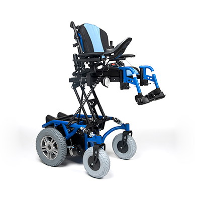Wózek z napędem elektrycznym dla DZIECI. Fantastyczne rozwiązanie zawieszenia kół tylnych i przednich oparte na amortyzatorach z regulowanym skokiem pozwala czuć najwyższy komfort podczas jazdy w terenie. Prawdziwa frajda podczas jazdy po nierównym terenie. Bardzo interesujące zawieszenie kółek przeciw-wywrotnych na systemie ROSTA skutecznie zabezpiecza przed niebezpiecznym przechyleniem wózka w sposób dopasowujący się do wysokości pokonywanej przeszkody. Opcjonalne wózek można wyposażyć w automatyczną regulację wysokości siedziska. Osoba siedzi na wysokości 73 cm, to zapewnia kontakt wzrokowy z osobą stojącą.