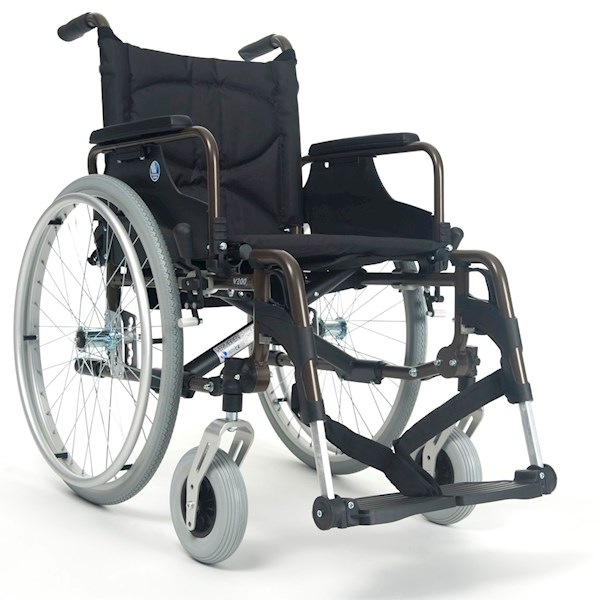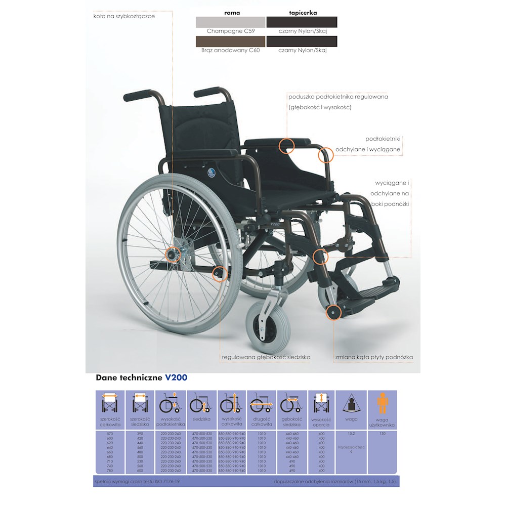 Wózek ze stopów lekkich. Kierujemy się myślą przewodnią: wózek musi być spasowany do użytkownika a nie odwrotnie. Dlatego nasze konstrukcje mają budowę modularną. Wszystkie nasze wózki są adoptowalne, posiadają dużą liczbę opcji dodatkowych, wszystkie opcje są wzajemnie wymienialne. To rezultat naszych ciągłych badań oraz 53 letniego doświadczenia. Gwarancja jakości. V200 spełnia wysokie europejskie normy jakościowe dotyczące tego rodzaju sprzętu:TUV, CERAH itp. Wózek jest również certyfikowany pod względem CRASH TESTU i spełnia normę ISO 7176-19.