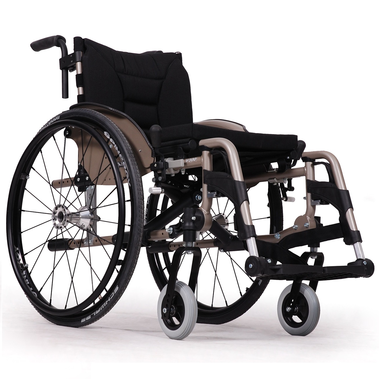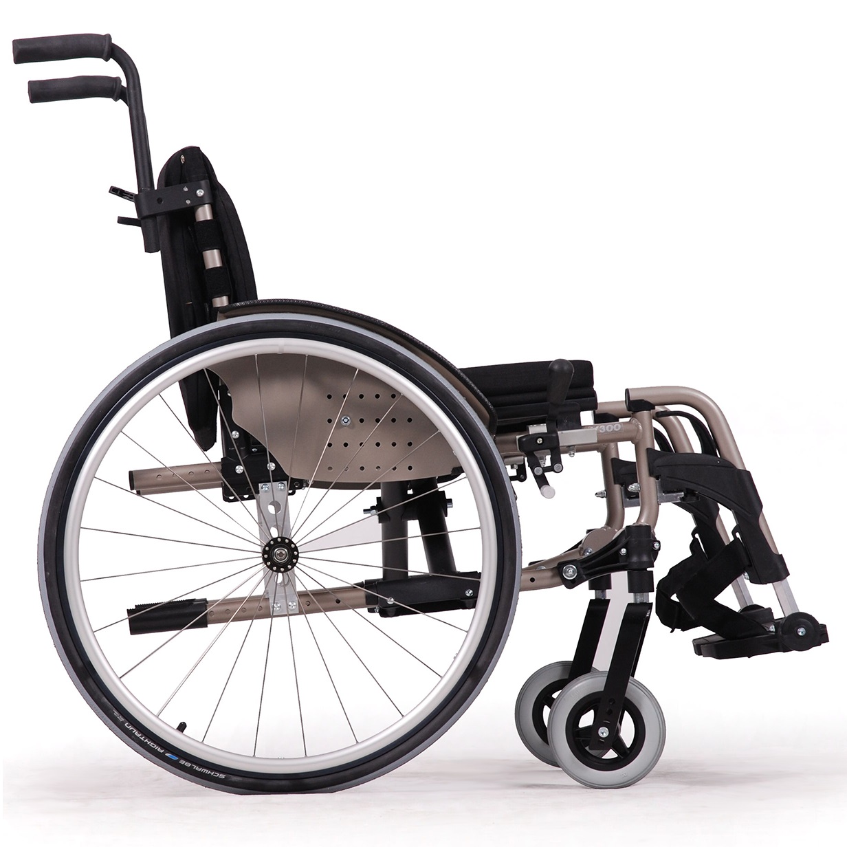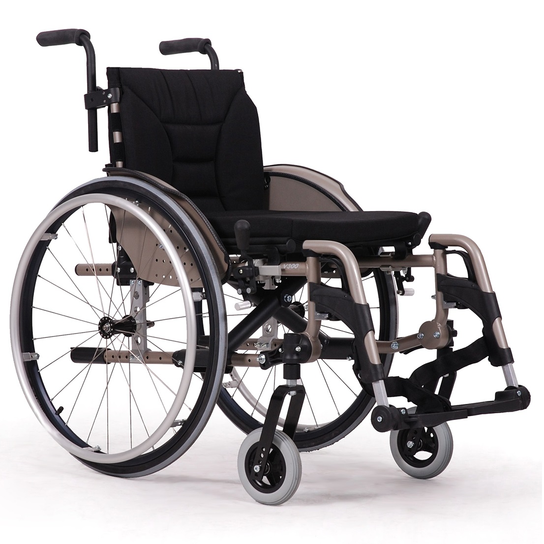 Wózek inwalidzki V300 ACTIVE wykonany został ze stopów lekkich. Aluminiowa konstrukcja krzyżakowa jest jednocześnie niebywale lekka i trwała. Modułowa budowa wózka pozwala na jego rozbudowę o dodatkowe opcje spełniające bieżące wymagania użytkownika. Dodatkowo w każdej chwili istnieje możliwość zmiany takich parametrów jak: wysokość siedziska od podłoża, głębokość siedziska, kąt nachylenia siedziska. Tapicerka wózka wykonana została z solidnego materiału, zapewniającego trwałość i niezawodność podczas aktywnego użytkowania.