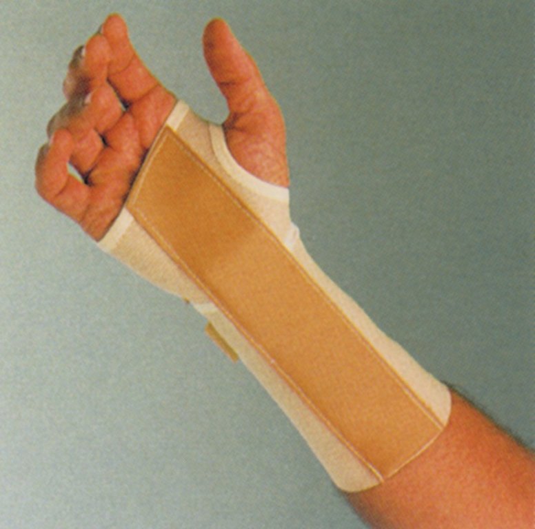 Stabilizator nadgarstka R1006. Wykonany z elastycznego materiału. Zapinany na rzepy. W części dłoniowej profilowane aluminiowe wzmocnienie. Długość: 22 cm. Dostępny w rozmiarach (wg obwodu nadgarstka): S (13-16 cm), M (16-19 cm), L (19-22 cm). Kolor beżowy.