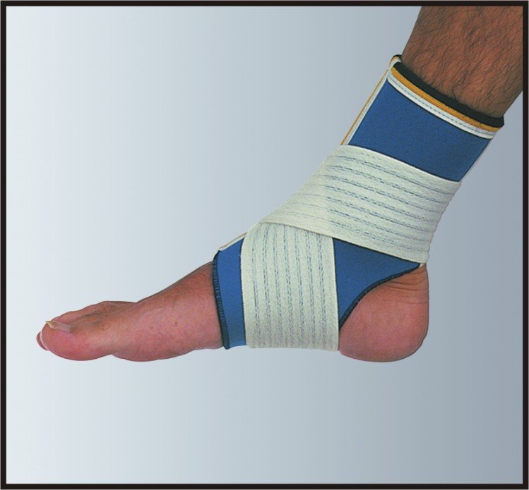 Stabilizator stawu skokowego - R2061. Stabilizuje i ociepla, zapinany na rzepy z otwartą piętą i palcami. Dodatkowa opaska (ósemka) wzmacnia stabilizację. Wyposażony w grzbietowy i podeszwowy pas stabilizujący. Wykonany z przepuszczającego powietrze neoprenu. Dostępny w rozmiarach (wg obwodu stawu skokowego): XS (21-23 cm), S (24-26 cm), M (27-29 cm), L (30-33 cm). Kolor niebieski.