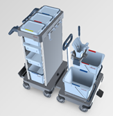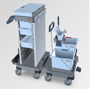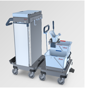Kompaktowy wózek z dodatkową podstawą jezdną z wiadrami i prasą do obiektów o ograniczonej powierzchni magazynowania