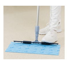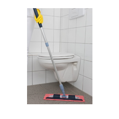 Wystarczy rzucić mopa na podłogę, nasunąć na niego uchwyt mopa i stopą zamknąć magnetyczny zatrzask.