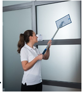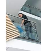 Teleskopowy uchwyt umożliwia bezpieczne czyszczenie balkonów i pozwala łatwo sięgać do 4 m nad poziom podłogi.
