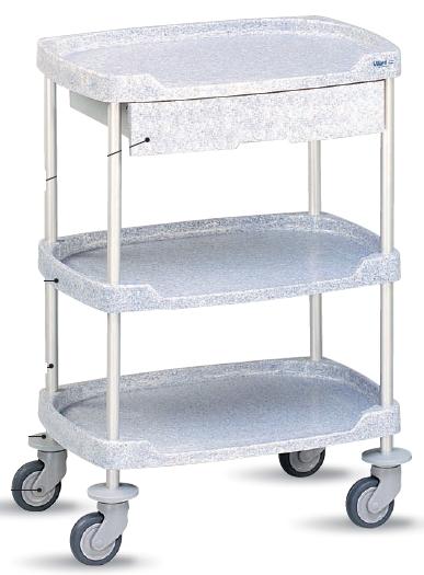 Zaprojektowany do codziennej pielęgnacji. Gładkie powierzchnie pozwalają na szybkie czyszczenie. Półki są odporne na wszystkie środki dezynfekcyjne używane w szpitalach. Tace z materiału kompozytowego. Aluminiowy stelaż. Krążki odbojowe. Skrętne koła o średnicy 100 mm. Kolorystyka tac: zielony, beż, niebieski. Bez suflad (opcjonalnie z szufladą), 3 półkowy. Wymiary półek: 64x48 cm.