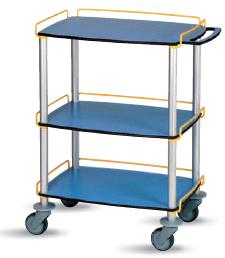 Materiał z jakiego zostały wykonane stoliki tj. profile aluminiowe oraz płyta z laminatu decydują o dużej trwałości stolika oraz łatwości utrzymania ich w czystości i możliwości dezynfekcji. Dopuszczalne obciążenie każdej półki wynosi 40 kg. Połki z płyty laminatowej o grubości 13 mm. górny balt z uchwytem do przetaczania. Aluminiowy stelaż z rur o średnicy 35 mm. Koła skrętne o średnicy 100 mm. Krążki odbojowe. Kolorystyka blatów i relingów: niebieski, kiwi, pomarańczowy. Stolik 3-półkowy, bez szuflady 65x45 cm.