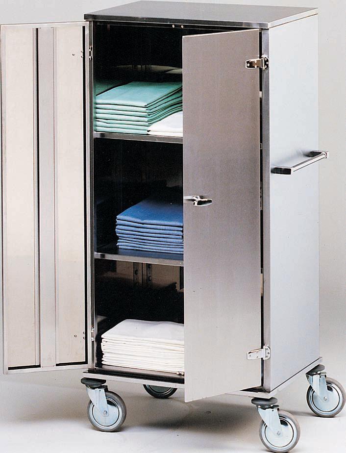 Wózki oddziałowe i do przewożenia bielizny. Wózki szafowe. Konstrukcja ze stali nierdzewnej w gatunku AiSi 304 lub lakierowana proszkowo. Uchwyt do przetaczania. Ścianki szafy wykonane z blachy nierdzewnej lub lakierowanej. Drzwi wahadłowe z zamkiem baskwilowym. Dwie półki z regulacją wysokości. Krążki odbojowe. Skrętne koła O 150 mm. Wózek ze stali kwasoodpornej.
