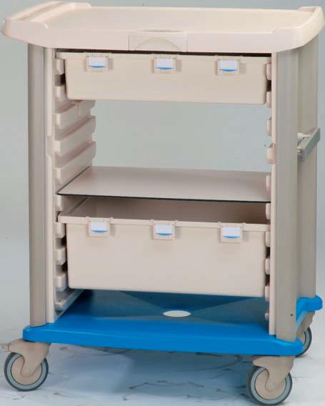 Wózek wielofunkcyjny zamknięty z 2 stron z serii Adaptis 10-modułowy. Wyprofilowane tworzywowe panele boczne. Podstawa ze zderzakami (odbojami) wykonana z tworzywa ABS, wewnętrzne prowadnice z tworzywa ABS. Dostępne kolory podstawy i etykiet: zielony, pomarańczowy, ceglasty, fioletowy, niebieski. Do wózka dostępny jest szeroka gama akcesoriów firmy Villard.