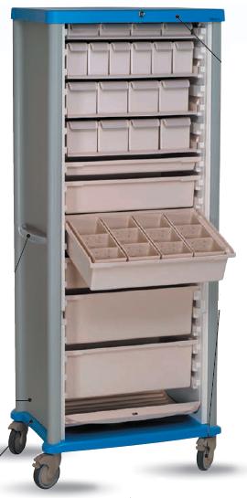 System ADAPTIS umożliwia również tworzenie wysokiej zabudowy meblowej - szaf mobilnych. Szafy formatu 600 x 400 mm są kompatybilne z całym zakresem wyposażenia ADAPTIS (szuflady, pojemniki, półki itp.). Koła jezdne pozwalają na przemieszczanie szaf w obrębie pomieszczeń. Roleta z możliwością zamknięcia kluczem lub przy użyciu kodu elektronicznego. Roleta jest demontowana i łatwa do dezynfekcji. Uchwyt do prowadzenia po lewej stronie. Wyprofilowane tworzywowe panele boczne i tylne. Odboje z tworzywa ABS. Koła O 125 mm, w tym dwa z blokadą. Górny blat wózka z tworzywa ABS. Molorystyka podstawy, blatu górnego oraz etykiet: zielony, pomarańczowy, ceglasty, fioletowy, niebieski. Szafa ADAPTIS 600 x 400 z roletą 20 modułów - H 193 cm.