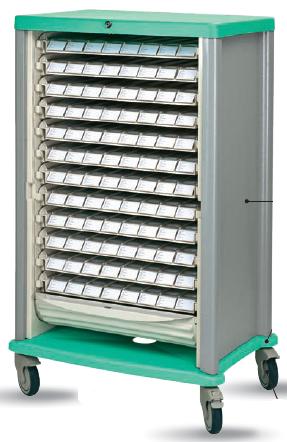 Wózek medyczny ADAPTIS. Wyprofilowane panele boczne. Podstawa ze zderzakami wykonana z ABS. Koła średnica 125 mm, w tym jedno z blokadą. 12 modułowy - H 132 cm. Dostępny szeroki wybór akcesoriów (opcja): zamknięcia, kasety medyczne, połki, uchwyty na kubki, kasety do trnasportu leków, pojemniki na substancje niebezpieczne, pojemniki ISO, pojemniki do szuflad, separatory do szuflad, wkłady do szuflad, lampki, uchywy, blaty do pisania, listyw boczne, wieszaki, kosze boczne, połeczki na laptop, tace, przegródki, odbojniki.