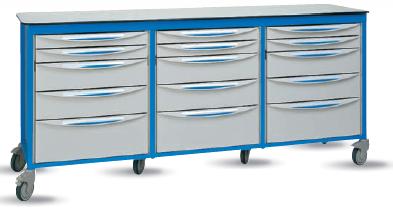 Stół mobilny trzysekcyjny w systemie ADAPTIS z szufladami (3 x 7 modułów). Trzy przyległe kolumny na kosze - jednostronne zamykane roletą. System ADAPTIS umożliwia tworzenie dużych przestrzeni roboczych - blatów do pracy wraz z przestrzenią do składowania, segregowania. Koła jezdne pozwalają na przemieszczanie stołów w obrębie pomieszczeń.. Górny blat wykonany z laminatu o grubości 12 mm w kolorze beżowym. Wyjmowane szuflady z pełnym wysuwem – opcja. Koła O 125 mm, w tym dwa z blokadą. Panele boczne i dno stalowe lakierowane. Blat z żywicy mineralnej. Kolorystyka ramy do wyboru: zielony, pomarańczowy, ceglasty, fioletowy, niebieski.