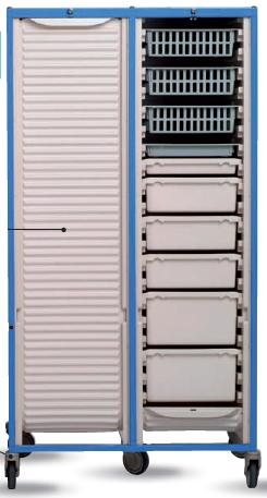 Wózek z serii ADAPTIS do przewozu i przechowywania z roletą. 2x16 modułów (2x16 prowadnic) - model podwójny. Rozmiar 400. Stalowa rama wózka. Koła o średnicy 125 mm w tym jedno z blokadą. Do wózka dostępny jest szeroka gama akcesoriów firmy Villard. Waga 49 kg. Max obciążenie 210 kg.
