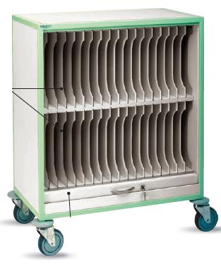 Wózek na dokumentację medyczną oraz zdjęcia RTG. Miejsce na dokumentację medyczną. Wyjmowane przegrody. Górny blat, tył i boczne panele z laminatu w kolorze bezowym. Odboje przy kołach. Skrętne koła o średnicy 125 mm. Miejsce na zdjęcia RTG. Miejsce na dokumentację medyczna formatu A4. Opuszczana roleta z zamkiem. Konstrukcja ramowa wózka, lakierowana. Warianty kolorystyczne: bezowy, żółty, pomarańczowy, czerwony, zielony, turkusowy, niebieski, jasnoniebieski, jasnozielony, fioletowy, szary, różowy. Pojemność: 36 przedziały na dokumentację medyczną formatu A4 w dwóch poziomach.