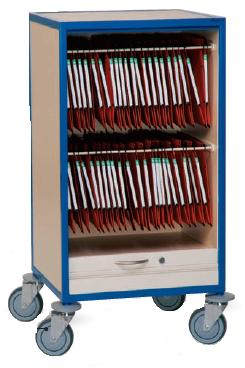 Wózki na dokumenty wykonane w technologii lekkiej konstrukcji, w mniejszych rozmiarach. Wózki mogą posiadać zamknięcie przy pomocy rolety. Wózki dostosowane do dokumentów formatu A4. Miejsce na 20 podziałek. Konstrukcja ramowa wózka lakierowana. Odbojniki nad kołami. Skrętne koła średnica 100 mm z łozyskami kulkowymi. Półki oraz panele boczne z laminatu w kolorze beżowym. Kolorystyka ramy łózka: bezowy, żółty, pomarańczowy, czerwony, zielony, turkusowy, niebieski, jesnoniebieski, jasnozielony, fioletowy, szary, różowy. 40 miejsc na dokumentację medyczną (grubość 15 mm) na dwóch poziomach. Z opuszczaną roletą.