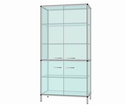 Szafa dwudrzwiowa przeszklona. Dowolny wymiar w zakresie 700-1200x250-600x1500-2000. Każdy mebel wykonany w tej technologii posiada szkielet - z anodowanych profili aluminiowych. Konstrukcja jest wyjątkowo mocna a zarazem lekka. Stosuje się cała gamę profili o różnych przekrojach, które dobierane są w zależności od przeznaczenia mebli, ich wielkości i wytrzymałości. Zaokrąglone kształty profili tworzących krawędzie - chronią użytkowników przed urazami. Ich powierzchnie pokryte są kolorową okleiną z PCV. Szkielet tworzący konstrukcję może być wypełniany płytami laminowanymi, szkłem lub blachą. Wszystkie pozostałe komponenty mebli tj. zawiasy, prowadnice szuflad, zamki - to konstrukcje wyjątkowo funkcjonalne, wykonane w najwyższym standardzie jakości. Meble są wyjątkowo estetyczne i przystosowane do intensywnej eksploatacji.