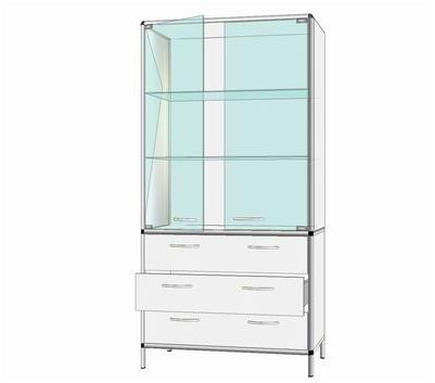 Szafa z szufladami -drzwi szklane. Dowolny wymiar w zakresie 700-1200x250-600x1500-2000. Każdy mebel wykonany w tej technologii posiada szkielet - z anodowanych profili aluminiowych. Konstrukcja jest wyjątkowo mocna a zarazem lekka. Stosuje się cała gamę profili o różnych przekrojach, które dobierane są w zależności od przeznaczenia mebli, ich wielkości i wytrzymałości. Zaokrąglone kształty profili tworzących krawędzie - chronią użytkowników przed urazami. Ich powierzchnie pokryte są kolorową okleiną z PCV. Szkielet tworzący konstrukcję może być wypełniany płytami laminowanymi, szkłem lub blachą. Wszystkie pozostałe komponenty mebli tj. zawiasy, prowadnice szuflad, zamki - to konstrukcje wyjątkowo funkcjonalne, wykonane w najwyższym standardzie jakości. Meble są wyjątkowo estetyczne i przystosowane do intensywnej eksploatacji.