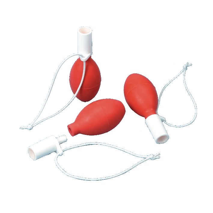 Kauczukowa, czerwona gruszka z plastikowym łącznikiem i silikonowym stożkowym adapterem, autoklawowalna.