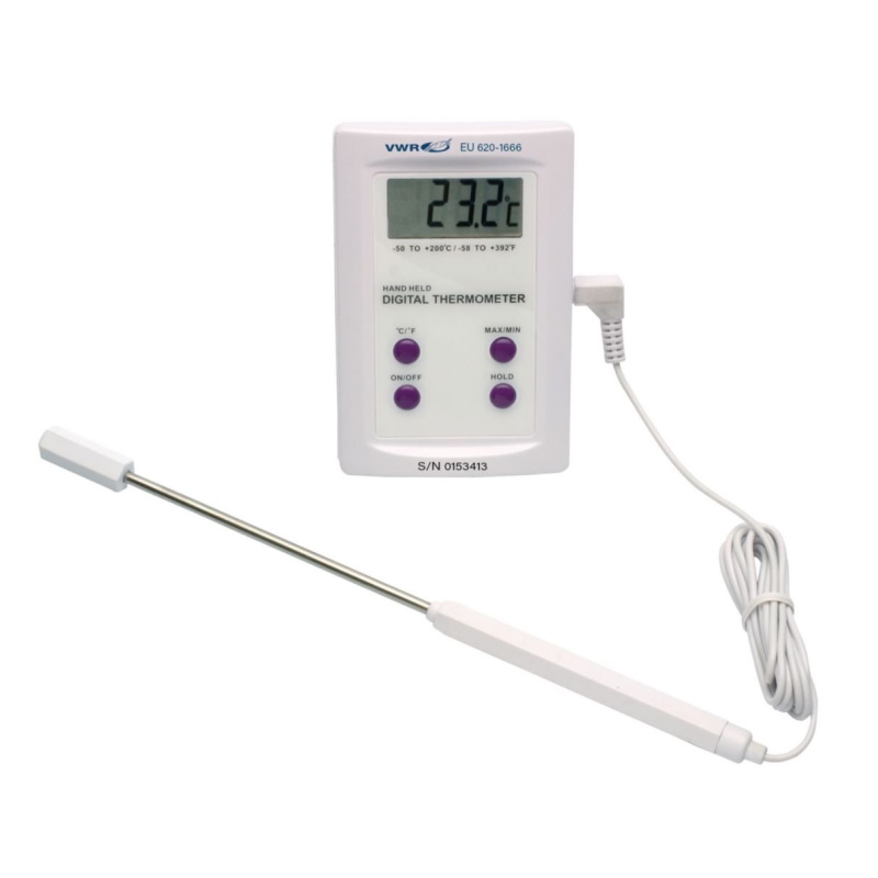 | With max./min., high/low alarm, data hold and temperature calibration IP 65, W×H: 135×22 mm | −50…+200 °C | ±1,5; ±0,5 (−10…+100) °C | 0,1 °C | - | - | Removable stainless steel (150 mm) | 1,0 m | 620-2710 |