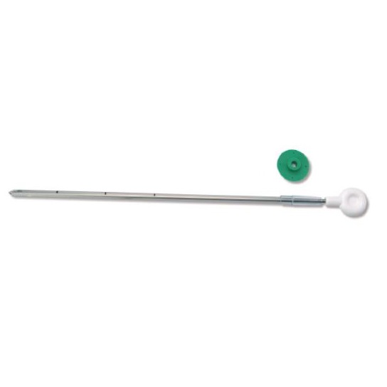 Przeźroczysty dren PVC. 2 boczne otwory i kołnierz mocujący. Znaczniki na 5, 10 i 15 cm od wierzchołka.